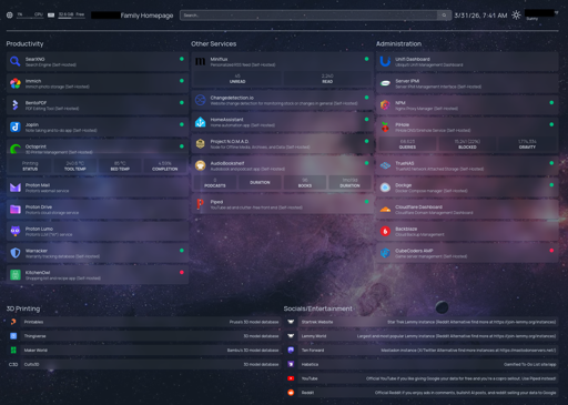 Looks great OP! If I hadn’t chose Homar long ago, it would definetly be the one I’d use. Homarr will do some metrics like Homepage. What kind of 3d printer do you have?