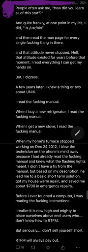 It drives me crazy when people double-down on some distinct thing (always read the manual) and then preach that it should always be the case or apply to all situations. There is a concept of diminishing returns and people should teach how to figure that out rather than blast out a good sound bite. Let people identify what works for them and be respectful of that. I’m not sure why that is such a hard concept for people.
