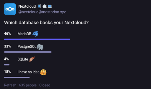 Nextcloud asked in a poll at https://mastodon.social/@[email protected]/115095096413238457 what database its users are running. Interestingly one fifth replied they don’t know. Should people know better where their data is stored, or is it a good thing everything is running so smoothly people don’t need to know what their software stack is built upon?