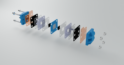 The aniolyth and catholyth are based on the Zink-Iodine system in an aqueous solution. There are a bunch of other systems though, each with their trade offs. The anode and cathode are both graphite felt in the case of the dev kit.